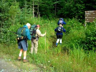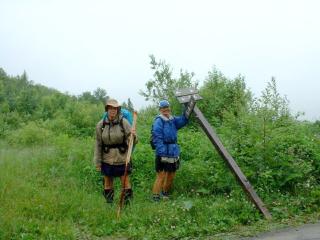 | When I found them they were on a road that was not where the trail was. I backtracked in the car to where the trail was supposed to turn into a field, but there was no sign or blaze. I passed a farm where a young boy was just leaving in his car. He didn't speak much English but with a couple of badly pronounced French words from me and pointing to the map, he indicated he would show me where it was. He drove to the spot I thought the trail was and walked into the weeds and pointed to a hole in the ground where the sign used to be. I went and got the girls and drove them to the spot. They dug around in the bushes and found the sign. They placed it so that it could be seen and continued on their way. |