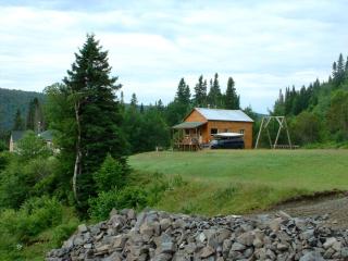 | They rent chalets here mostly to fishermen and hunters. The a-frame next to the cabin in the picture looks like something used to change engines in cars, but is for dressing moose. We have seen a few moose but no pictures yet. |