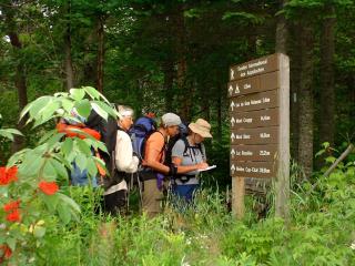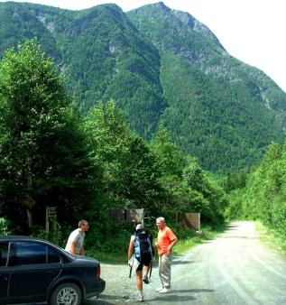 | The next day Jerry and I drove to the next town to scout out campgrounds and drove back by way of where we would pick up the girls when they came out. On the gravel road between St. Ann and the trailhead (23 miles) we saw 2 hikers hitching a ride. It was a man trailnamed "Mountain Dancer" and his son. They had walked to town for food and were returning to where we we going. They had started at Gaspe and were planning on going to the Canadian border. When we got to the trailhead, Jerry saw the mountain and decided that he had made the right decision in not hiking. The trail goes off and down to the left. It took Chuck Wilson 2 hours to get down when he hiked in 2000. |
