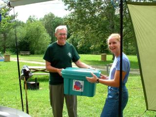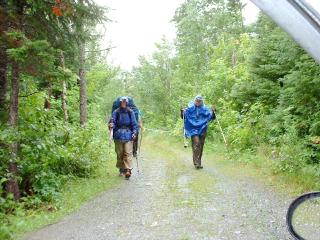 When we left off in the last issue we were having lunch at the campground in Causapacal. The girls hiked the section north from the campground after lunch and were not very happy when they returned. It seems that the farmer whose hayfield the trail goes through had spread cow manure on the field the day before. It was the liquid kind and was spread all over. They were not "happy hikers". The only "good" thing about the day was that there was an unexpected stream crossing that they had to wade thru. The bad thing was that Judy and Darcy had on new shoes that they were breaking in. |