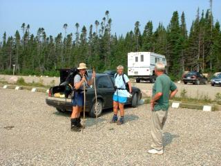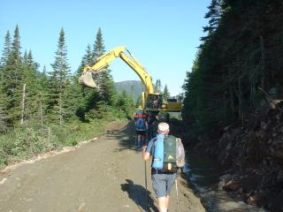 The first day I had to drive about 40 miles back a gravel road to drop them off for their 2 day trip over Mt Logan. We were stopped about 1 mile from the trail by a backhoe repairing the road. They had to walk. |