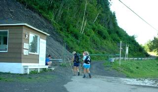 | The next day they started hiking at Mont Louis and went up the road seen in the previous picture. I scouted ahead in the car. After about 5 miles there was a washout. They could walk across but I had to backtrack 5 miles and go around. When the hikers got there Jerry decided to take the shortcut down the main road and the girls followed the trail over the hill. Jerry lucked out again. Someone had torn down the trail signs in at the intersections of several gravel roads and the girls got lost. They called on the radio and ended up backtracking to the washout where we picked them up. |