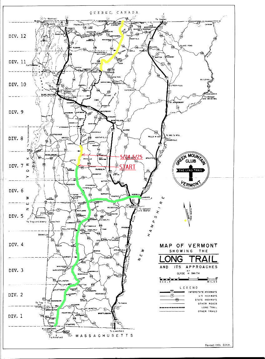 We went to a slide presentation of the International Appalachian Trail. Judy is more excited than ever after seeing what the area looks like. She met several other girls who will also be hiking there and may join her. Chuck Wilson (red shirt left picture) has hiked the trail and is going to meet us in Maine on July 4th and may shuttle 2 girls who are thru-hiking the whole trail from Key West up to join us there.We left Damascus on spent 2 days getting to Brandon, VT. This is a map of where she is now.