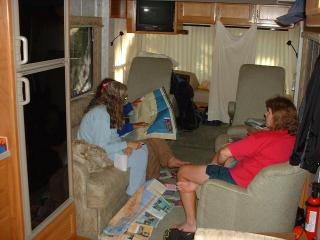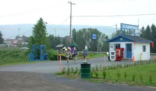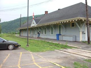 | Since the girls haven't had a day off in a couple of weeks, they decided to have a "0 mile day". We also had to meet Beth Kelso, from Naples, FL, who was arriving by train in Matapedia. The train was schedule to arrive at 4:45 AM, but we said we would pick her up at 8:00. She left her luggage at the station and went to a restaurant a block away for breakfast. When we found her we went back to the station and discovered that it's only open when a train is due and the next one wasn't until 9:00 that evening. That's Beth looking at her luggage thru the window. |