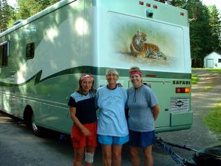| That day I saw a hiker on the road North of Squaw Cap Mountain. It was Ellen "Twisted Sister 2" Wilcox hiking south-bound. After introducing myself and who we were, She said she would like to spend the night at the campground and "swap stories". We picked her up on our way back and they spent the evening going over the maps. We dropped her off the next morning to continue her journey to be the first female from Canada to thru-hike the IAT. |