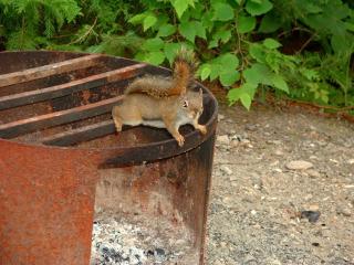 | We also had a regular visitor to camp who tried to jump on Darcy's head. We had to buy plastic bins for the food because he would chew thru the bags. He even chewed thru Darcy's clothes bag and tried to eat her underwear. |