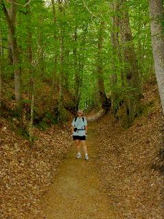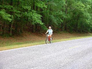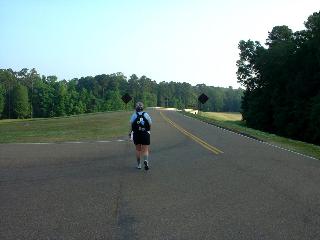 | Judy started hiking the Natchez Trace. It's the trail that the riverboat people took to return North to Nashville and then on to Ohio. They would bring their boats of cargo down river to Natchez and there they would dismantle the boat and sell the lumber. Around 1820 the steamboats began operating and the trail wasn't used much more. The Trace today is a parkway that roughly follows the original. There are sections of the original that can be seen. |