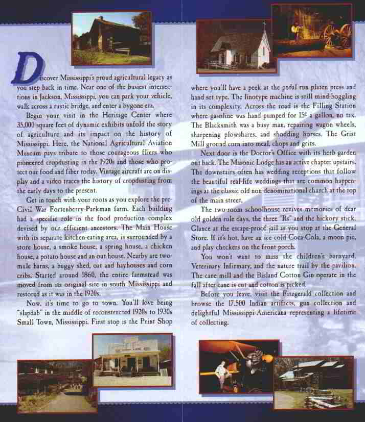 We are now (5/7) in Jackson, Ms and are taking a day for touring and getting the mail. Of course the mail wasn't there and we must wait until tomorrow. We visited 2 museums, The Natural History Museum (left picture) and the Agriculture Museum. Both were interesting and well done. A description of the Agriculture Museum is below. |