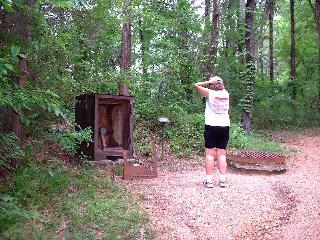 Rocky Springs was a prosperous community of the 1800's that thrived as a center of agriculture and commerce. The cotton that made the town rich, however made the soil poor. Gradually the earth became depleted and eroded, and by 1930 Rocky Springs was a ghost town. Today only a church, a cemetery, and a rusting safe once filled with treasures remain of the once-bustling community. Judy is checking out the safe.
