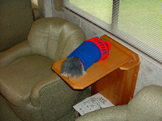 Platy has not been happy with the weather here. It has rained every day and it has gotten cold. Last night it was in the 30's and they reported snow on the Volksmarch to the top of Crazy Horse. He has been sleeping in his sleeping bag at night. It's really a knit hat. We haven't told him what the writing is on it. |