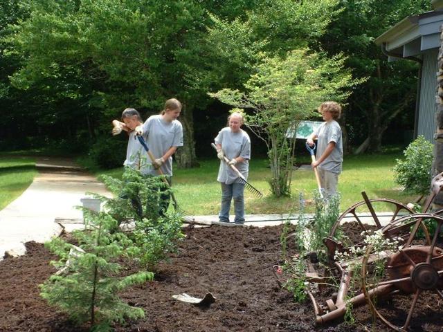 In July there was a group of 12 YCC (Youth Conservation Corps) girls here working for 3 weeks. Ken and Phyllis Weber were here camping at the same time. We all volunteered to supervise a couple of landscaping projects that the girls could do. This is the front of the Visitor Center. Phyllis picked out some native flowers and shrubs. We then went out and dug them up from around the park and along the roads. |