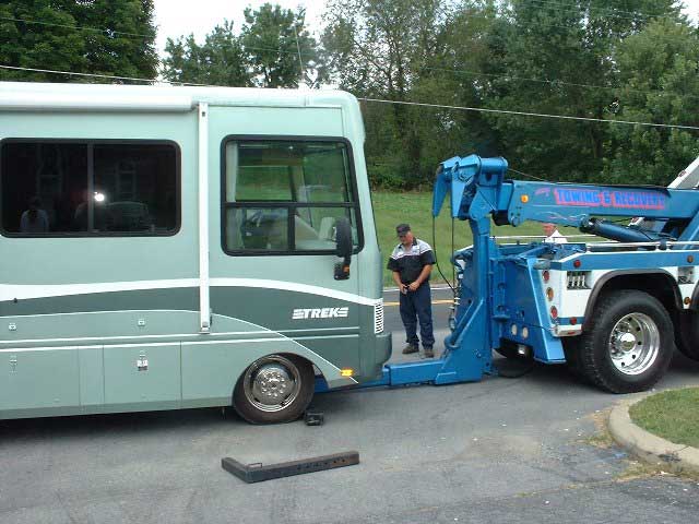 We had driven down the mountain when we smelled something but stopped and could not tell what it was. When we stopped in Abingdon for propane we had no brakes. A caliper had stuck and overheated the right front wheel. Three hours later the tow truck arrived and we were towed to Kingsport, Tennessee. They couldn't get all the parts until the next day so we spent the night in the parking lot at the RV repair shop. |