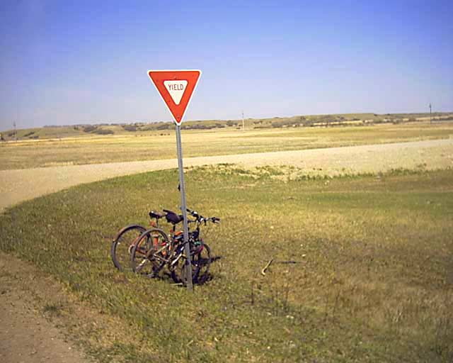 bikes to a sign and walk. A farmer who was moving hay bales stopped