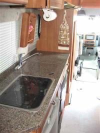 The galley has a 2 burner stove, sink, small refrigerator, and a convection